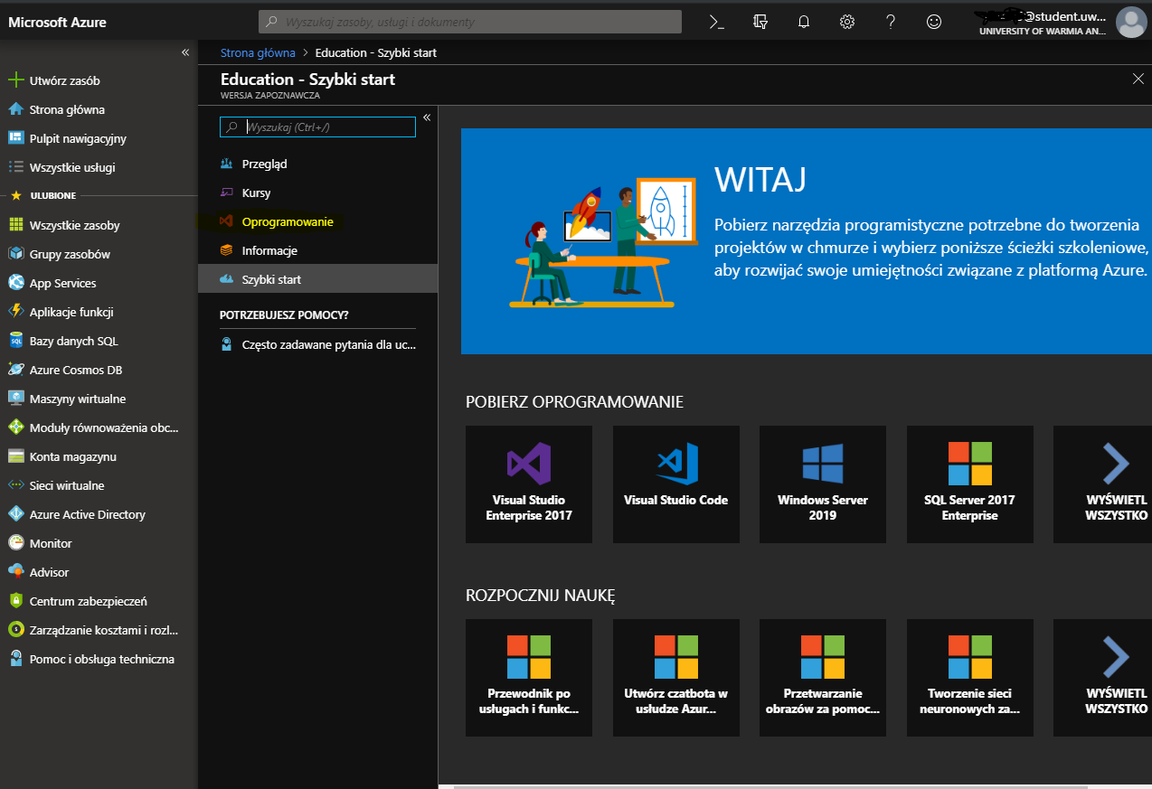 6. W zaznaczonym na żółto panelu "Oprogramowanie" możemy znaleźć klucze licencji i pobrać oprogramowanie udostępnione w ramach programu (np. Windows 10 Education)