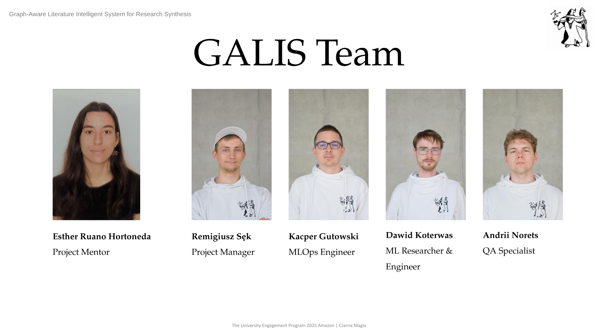 GALIS, czyli Graph-Aware Literature Intelligence System for Research Synthesis, to aplikacja webowa, której celem jest wspomaganie badaczy z dziedziny informatyki w automatyzacji tworzenie sekcji "Related Work" i "References" w publikacjach naukowych. Pisanie tych sekcji to notorycznie czasochłonne zadanie, które wymaga nie tylko streszczenia poszczególnych publikacji, ale też zrozumienia złożonych relacji między pracami naukowymi. Nasze rozwiązanie wykorzystuje graf semantyczny do mapowania relacji między artykułami naukowymi i ich kluczowymi koncepcjami, co pozwala generować spójne i trafne bibliografie oraz sekcje z przeglądem literatury.